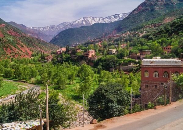 Scenic drive from Marrakech into the High Atlas Mountains with views of terraced fields and Berber villages.